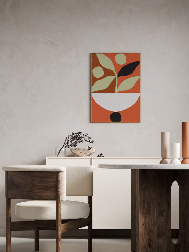なんだか見たことあるような植物のシルエット。こちらは【Monstera】。観葉植物のモンステラの生き生きとした躍動感を表現しています。ベージュ、ダスティピンク、ライトブラウンを背景に、ブルー、ブラック、ホワイトを組み合わせが実に美しい作品です。