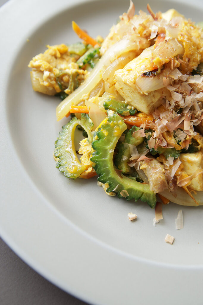 盛り付けに使用したプレートは【Ena リムプレート27cm】。クールグレーの軽やかな色味が、ゴーヤやニンジン、卵などの食材の色彩を引き立てて、よりおいしそうに見せてくれます。
