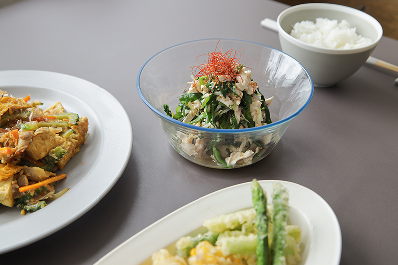 もう一品、「ささみとニラのサラダ」もあります。スタミナ野菜ニラをさっぱりいただけるので、箸休めとしても最高です◎【リップル サービングボウル】に盛りつければ、さわやかさ満点の夏の食卓が完成!このボウルは4個セットなので、家族でじゃんじゃん使ってください。