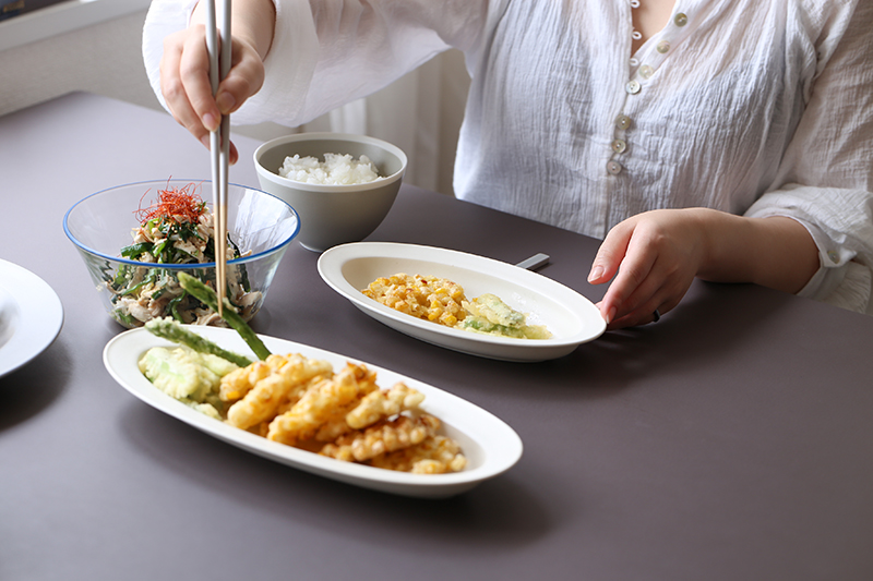 豪華副菜揚げ物セットは【オーバルディーププレート(31cm)】に盛り付け、同プレート(24cm)に各々取り分けるスタイルでいただきます。プレートに深さがあると、こうやって立体感ある盛り付けが簡単にできるとわかりました。この細めのオーバル型というのもきっとポイントですよね♪