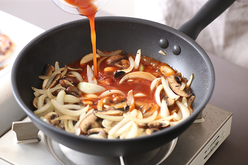 お肉を焼いたのと同じフライパンで、続いてはソース作りです!玉ねぎとキノコ(この日はマッシュルームでした♪)を軽く炒め、トマトケチャップを投入。ジューッといういい音が耳をくすぐります。