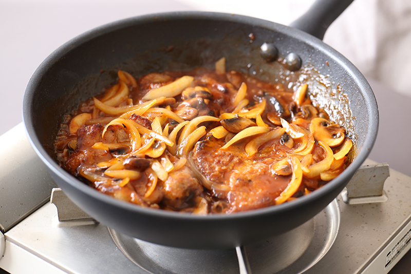 MEYER(マイヤー)の【ミッドナイト フライパン】でお肉を焼き、おいしそうな焼き目をつけていきます。作業場にいい音、いい香りが満ちてきました(テンション上がる〜♪)。ちなみにここでのポイントは焼き具合。「焼くとき、お肉の中まで完璧に火が通ってなくても大丈夫◎このあとソースを煮るときに火が入るから」とのこと。