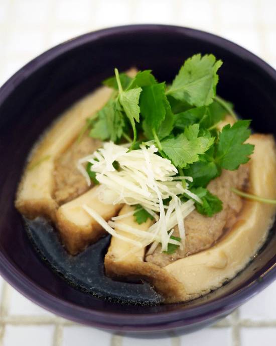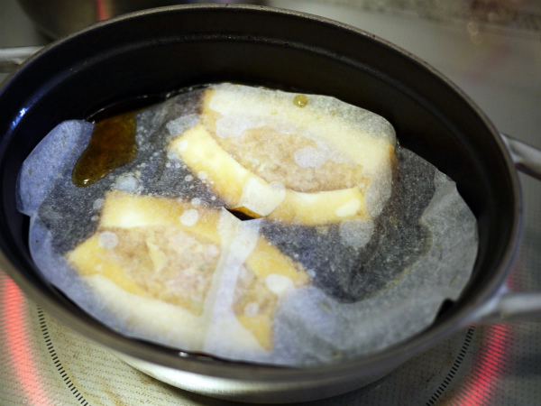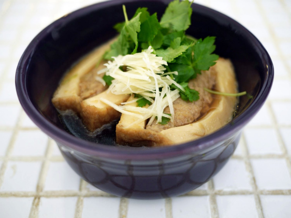鍋に煮汁を熱し、4の厚揚げを入れる。アクをとり、落とし蓋をし味を煮含ませる。15分程度。