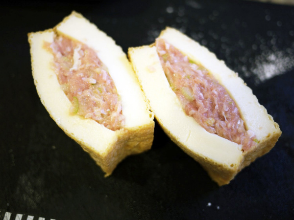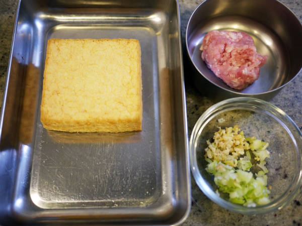 厚揚げの内側にのり代わりの薄力粉をまぶし、3のあんを詰める。