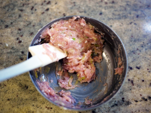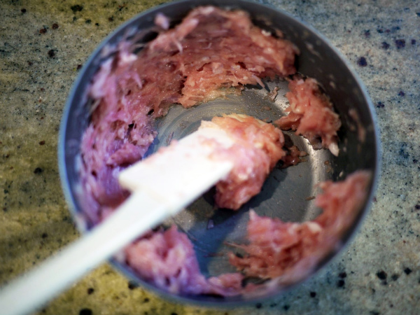 ボウルにひき肉と塩を入れ、粘りが出るまでよく混ぜる。