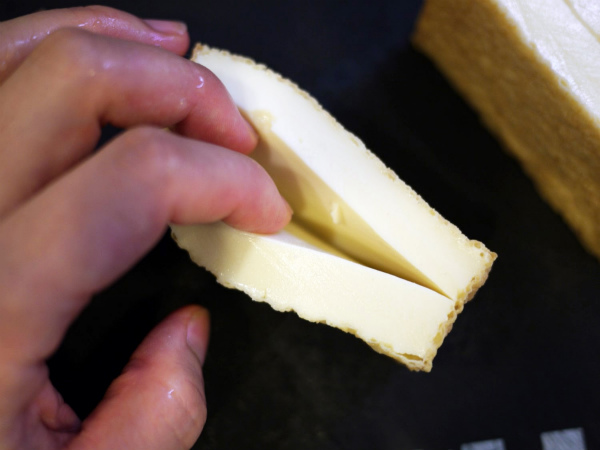 (大きい厚揚げの場合は半分に切ってから、小さめの厚揚げの場合はそのまま切り込みを入れる。)
