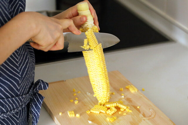 とうもろこしは包丁で身を削ぐ。芯の部分は半分に切る。