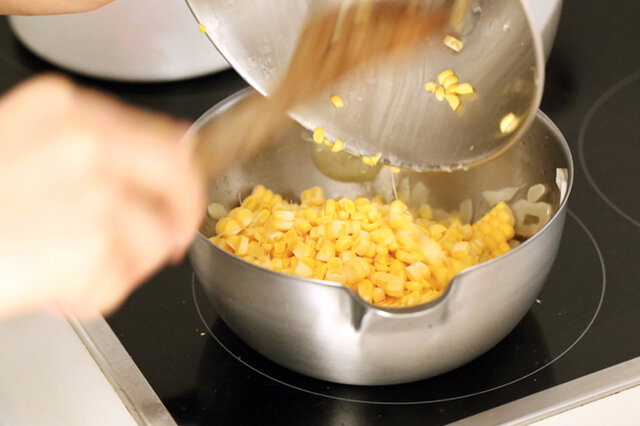 トウモロコシの芯を取り出し、牛乳を加え弱火で5分ほどコトコト煮る。