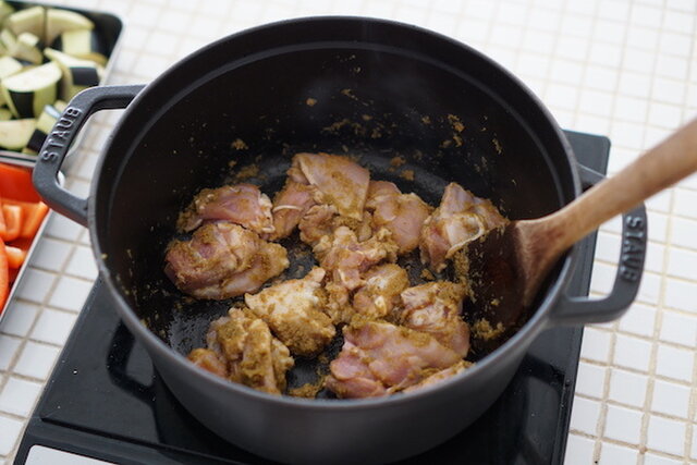 鶏肉の表面の色が変わってきたらココナッツミルク、水を入れる。沸騰したら、弱火〜中火で10分ほど煮る。ズッキーニ、パプリカ、茄子を加え更に8分ほど煮る。