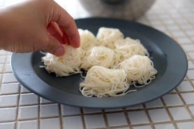 素麺は1分半〜2分茹でた後、冷水で揉むように洗い、水気を切る。