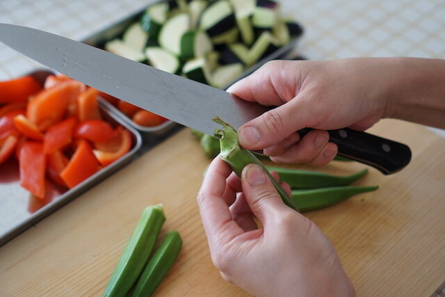 オクラはガクをとり斜め切りに、プチトマトはヘタを取っておく。鶏もも肉は余分な脂を取り、一口大に切る。