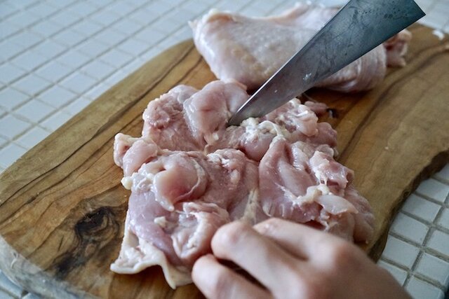 鶏もも肉は脂と筋を取り除き、厚みを均等にならす。
