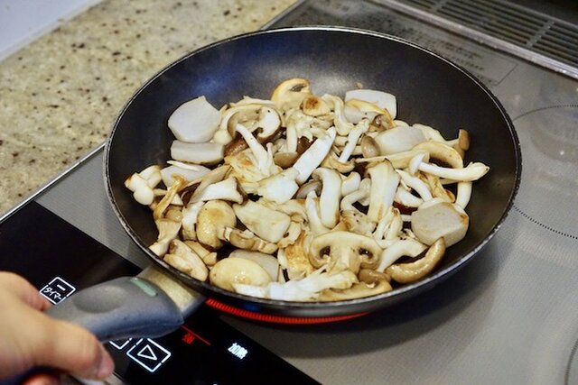 きのこに美味しそうな焼き色がついたら、塩をふたつまみ加え味を調える。