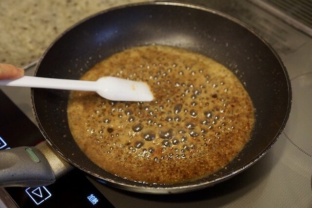 ヘラでフライパンに残った旨味をこそぎ落としながら弱火で1/3量まで煮詰める。