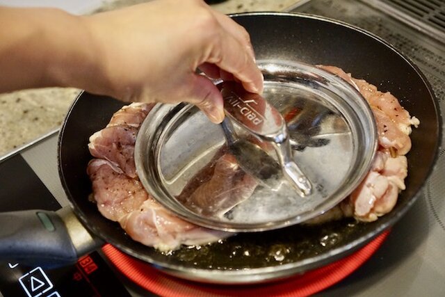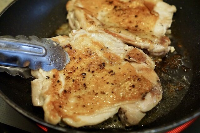 7割ほど火が通り皮目がパリッときつね色に焼けたらひっくり返し、弱火にし4分程焼く。