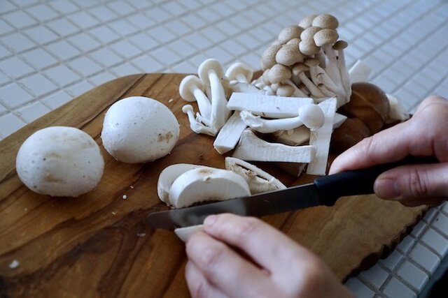 椎茸とマッシュルームは食感が残るよう厚めのスライスにする。