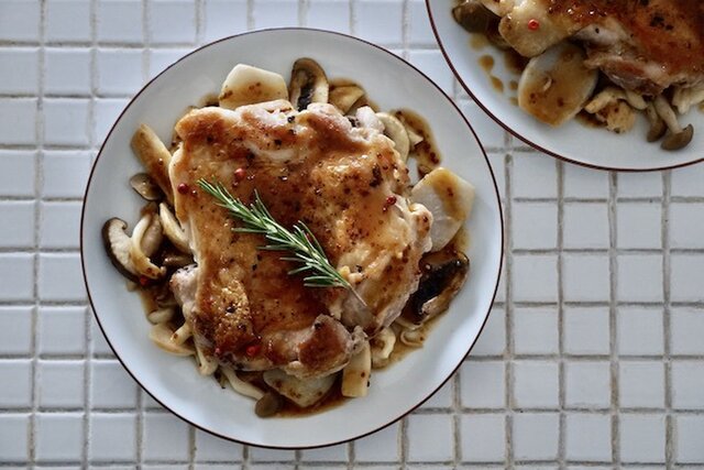 お皿に付け合わせのきのこと里芋を敷き、鶏もも肉を乗せる。