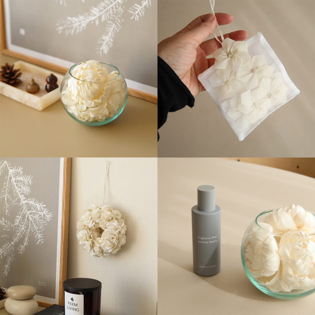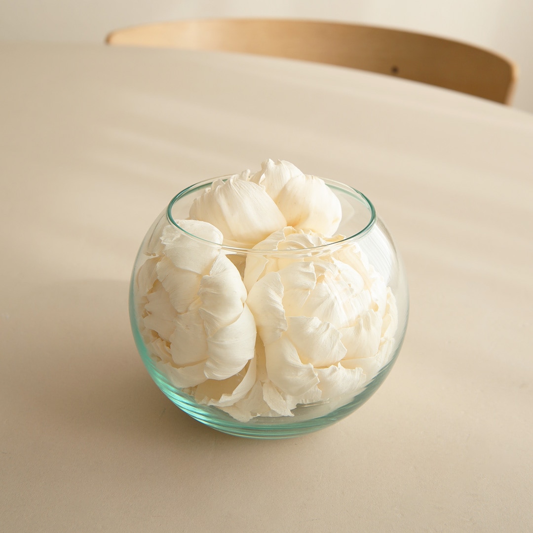 お花はやさしいクリーム色。ソラフラワー自体に香りは付いておりませんが、別売りでご用意しているソラフラワー専用【フレグランスミスト】をお使いいただくと、香りのアイテムとしてお使いいただけます。