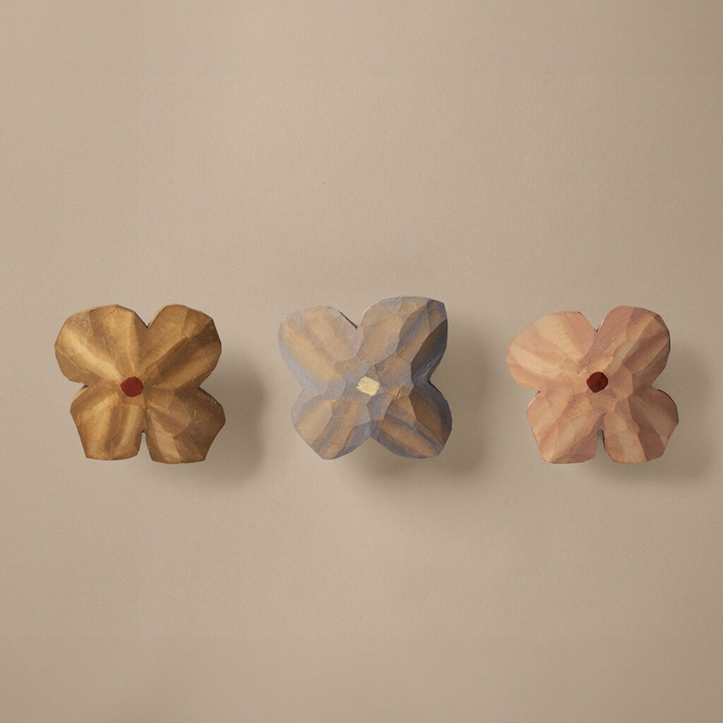実はこれ、木彫りのお花のマグネット。4枚の花弁と、ラフなタッチのお花のかたちがなんとも可愛いアイテムです。