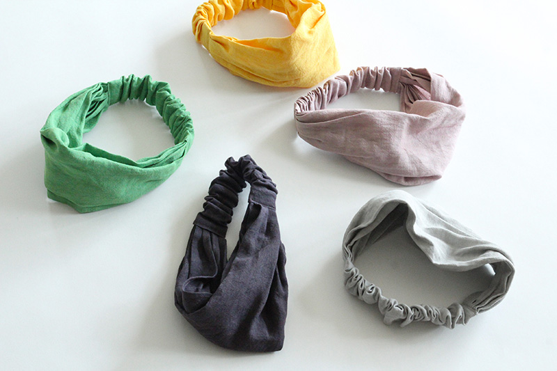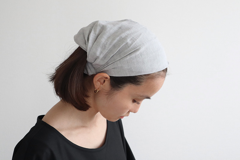 リネン生地の重なりを広げると、こんな風に髪を包み込むようにまとめることができるので、掃除中のほこりも気になりません◎