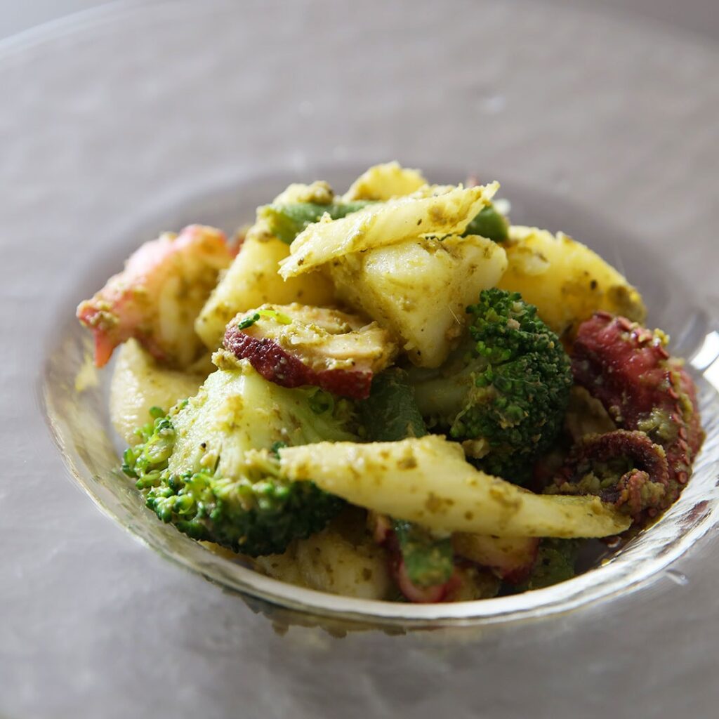 タコと茹でたじゃがいもをジェノベーゼソースで和え、前菜として提供。バジルの香りがタコの旨味と絶妙にマッチします。