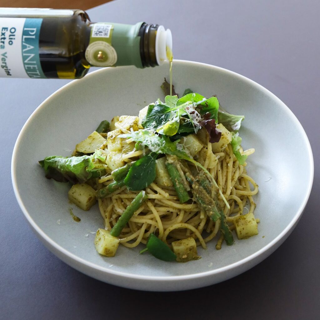 料理を盛り付けた後に、PLANETAオリーブオイルをひと回しするだけで、さらに深い味わいが楽しめます。ジェノベーゼソースの風味を引き立てる一手間で、より美味しさが増します。