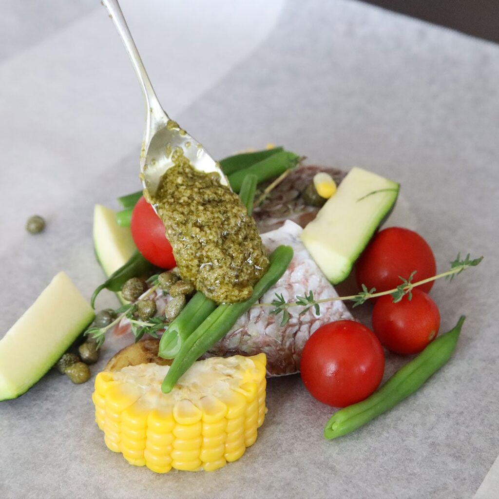 白身魚のホイル焼きにジェノベーゼソースを少量加え、レモンを添えることで、爽やかな風味が引き立ちます。