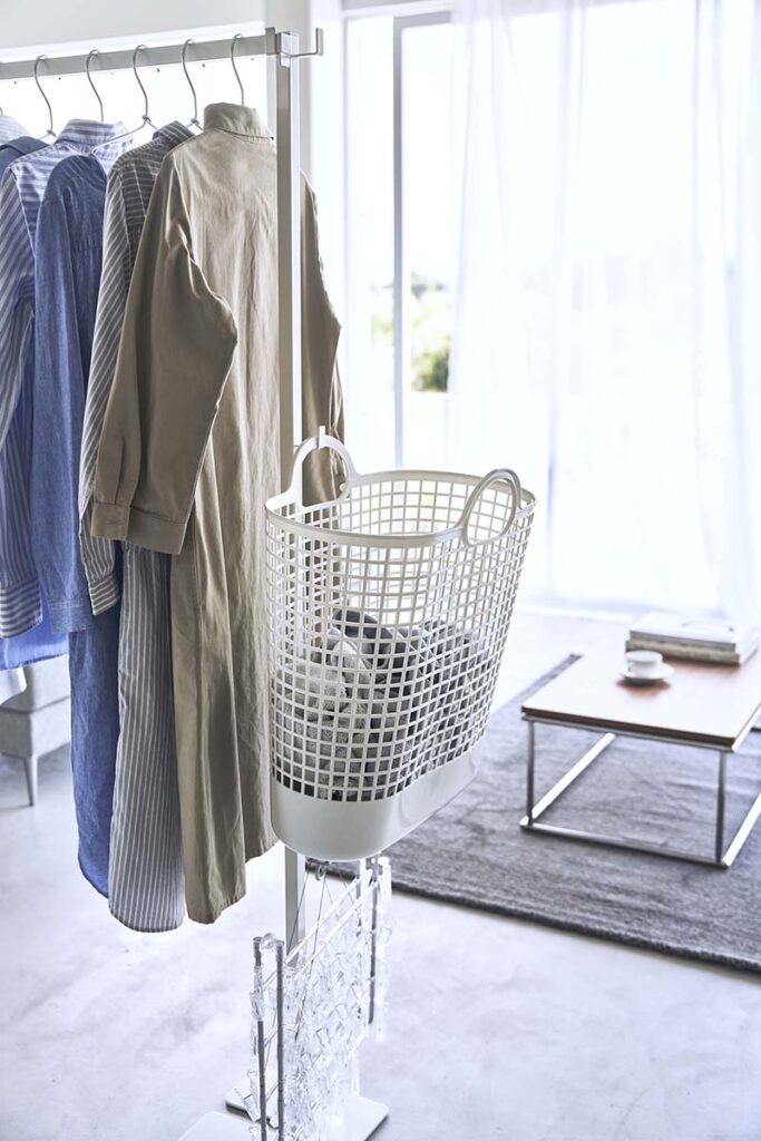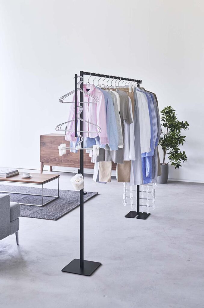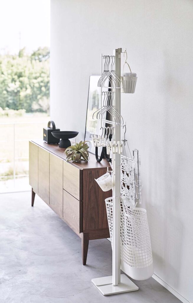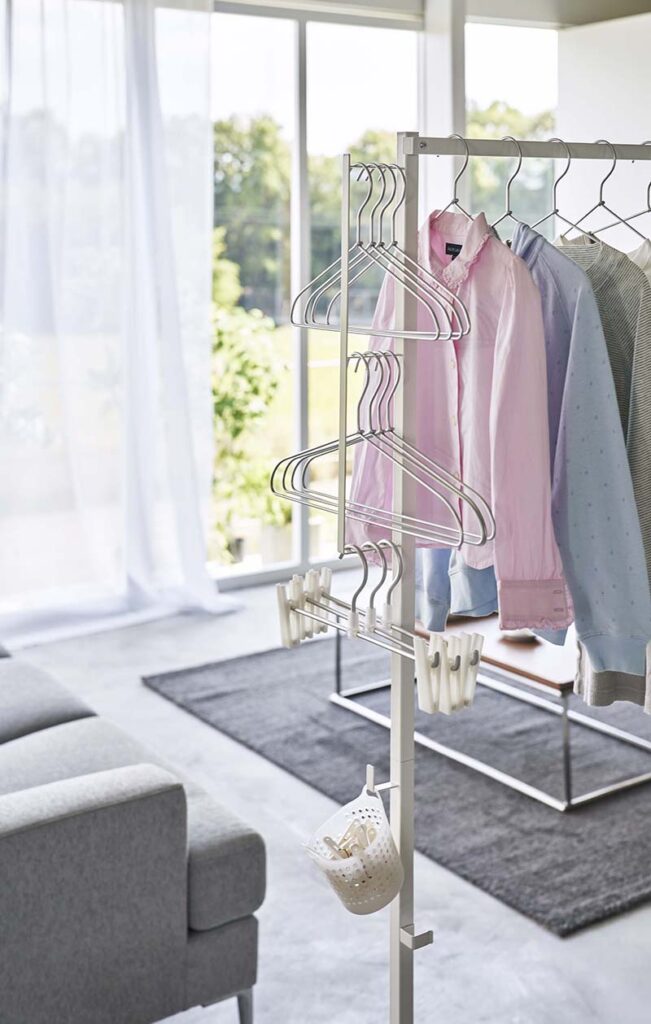 しかも各支柱には、さまざまな用途に使えるフックがついていて、ハンガーや洗濯バサミなどのお洗濯アイテムをひとまとめにしておくことができるんです。