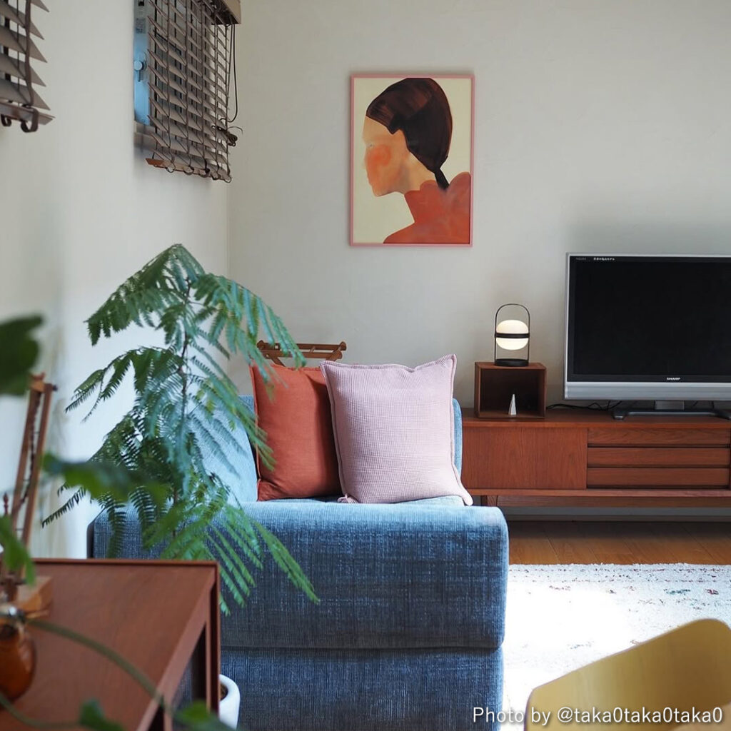 寒色系のラグともいい対比が生まれて、とてもおしゃれな空間に。